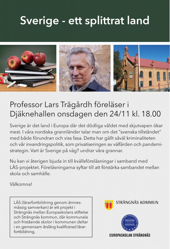 Hur kommer det sig att Sverige är det land med mest dödligt våld i Europa? Hur står det egentligen till med det “Svenska tillståndet”? Och vart är Sverige på väg? Det är några frågor du får veta mer om på professor Lars Trägårdhs föreläsning “Sverige – ett splittrat land”.