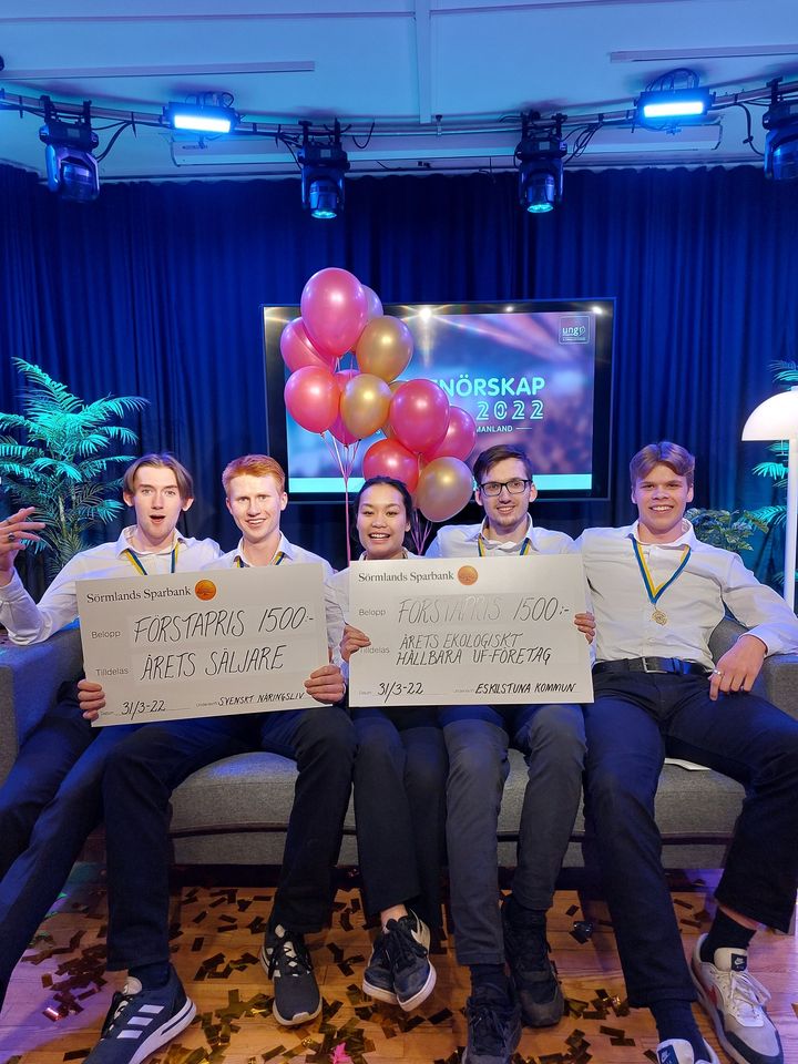 De elever som kom på första plats i kvaltävlingen med deras lärare, från vänster: Gabriel Thåström, Arvid Lindqvist, Linda Eriksson lärare i engelska och idrott…